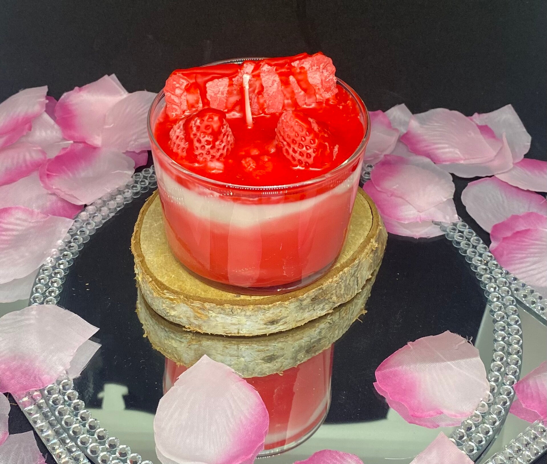 Bougie gourmande rubarbe fraises 🍓 régalez vos sens grâce à notre gamme de bougies gourmandes pour un plaisir à la fois visuel et olfactif.