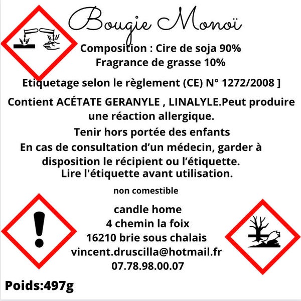 conposition: Cire de soja 89%/ Fragrance de grasse 10% /colorants naturelle 1 %/ Méché coton pré-cirée.